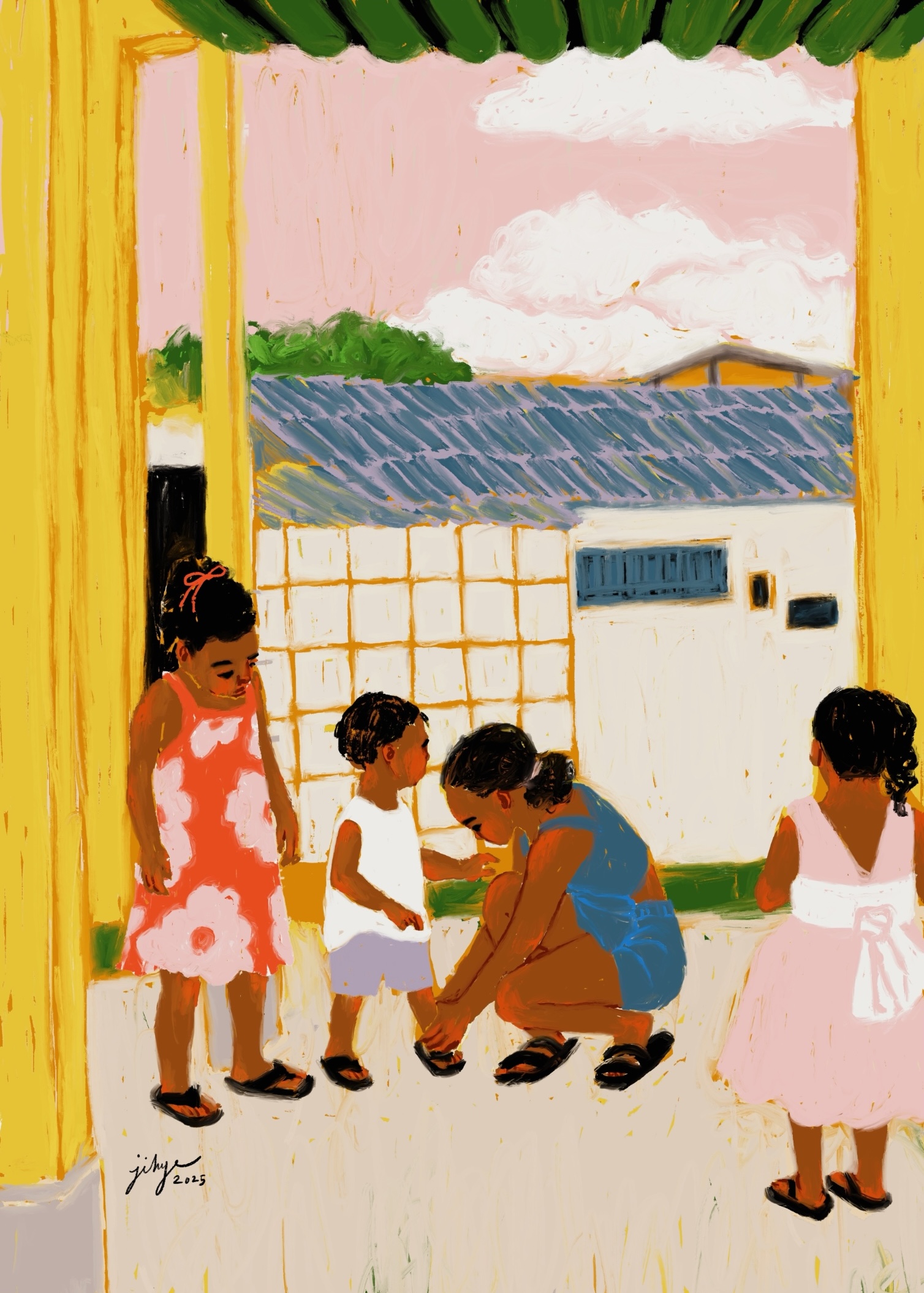 The series Todos os Dias de Você (‘Every Day of Yours’) presents a collection of works inspired by the daily lives of people in Recife, Brazil, with particular attention to the Milagres Community. Through these paintings, the artist sought to depict ordinary moments with honesty and restraint, avoiding embellishment or sentimentality. Her perspective, shaped by her role as a missionary, reflects both a deep engagement with the community and an acute awareness of the limitations of her own ability to alleviate their daily struggles.